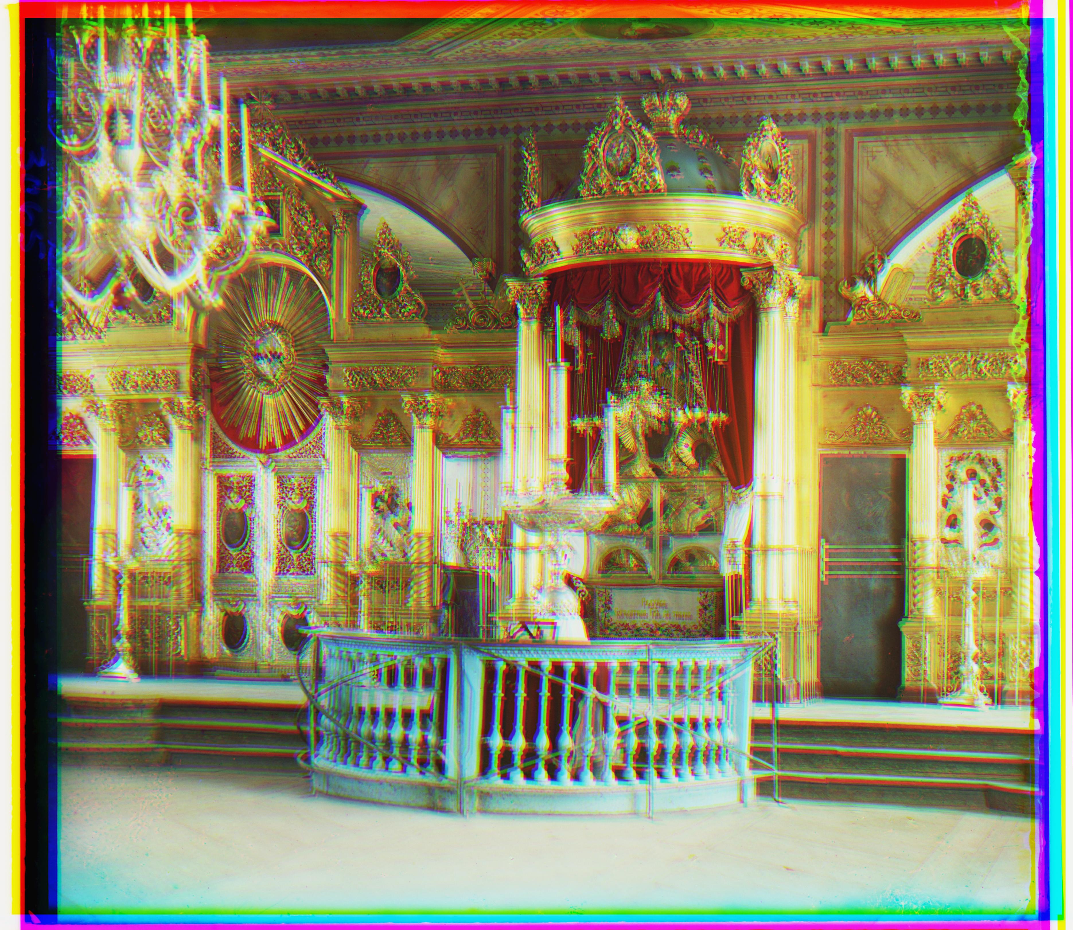 The images were separated into their RGB components in place. Image alignment was done brute force, then with a coarse-to-fine pyramid speedup.