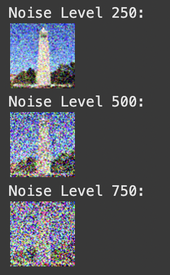 The first thing I did is experiment with nosing the following are my base image (only 64x64 for runtime purposes), and noised images at varying noise levels.